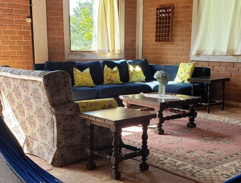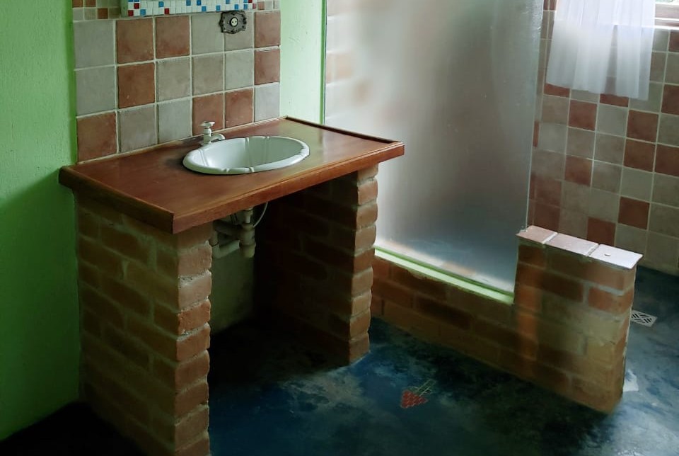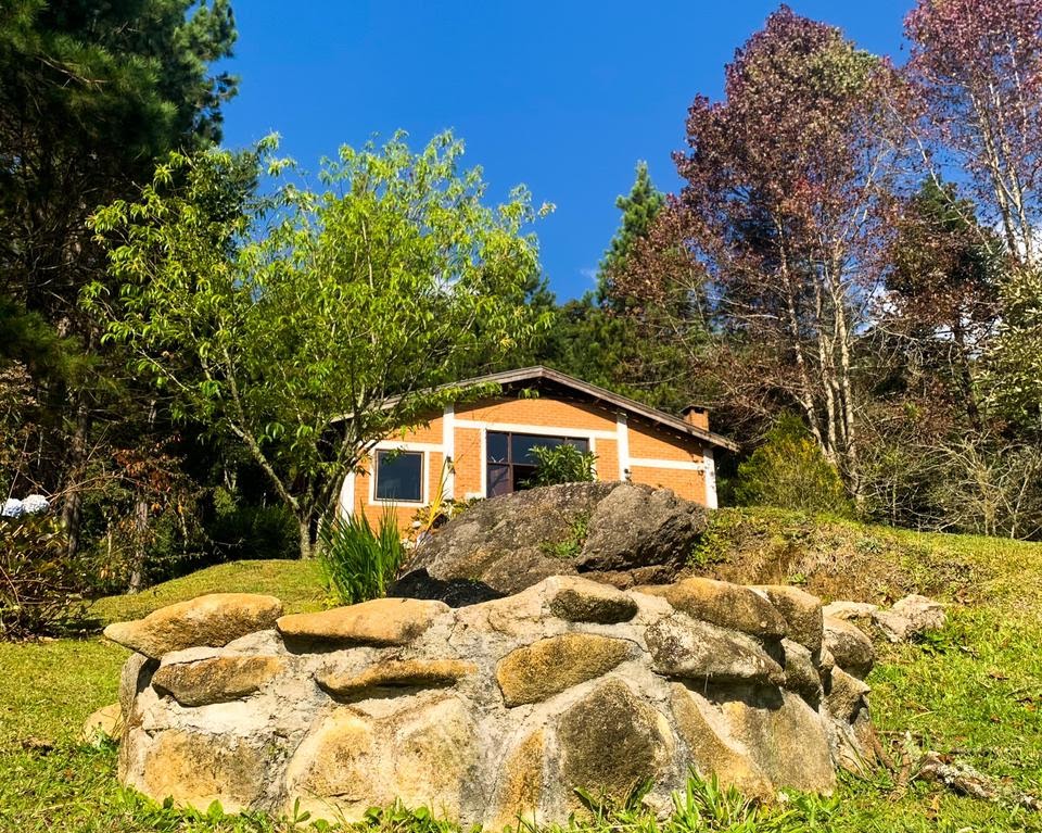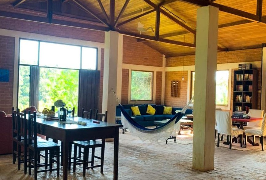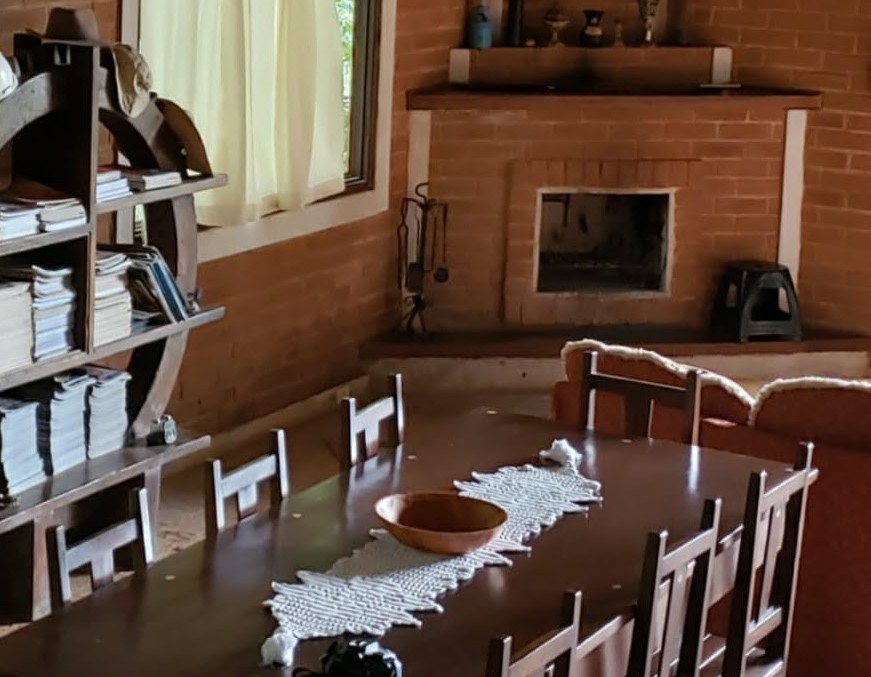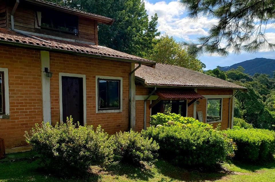 Casa ampla, rústica e aconchegante com paredes de tijolo colonial. Sala com lareira medindo 100m² integrada a cozinha com fogão de lenha e churrasqueira. Possui 3 quartos sendo 1 suíte e 1 banheiro social. Chão rústico feito dos mesmos tijolos das paredes.